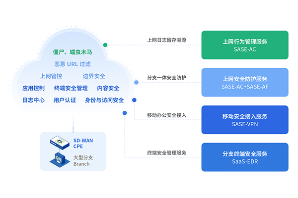 分支仅需部署一个端,提供三种灵活多样的SD-WAN解决方案实现分支机构与总部、数据中心、公有云的互联;云端按需订阅上网行为管理、下一代防火墙、终端安全等安全服务,实现分支机构与移动用户安全的访问SaaS与互联网应用;选择组网托管服务实现组网与安全的省心托管;通过一个运营管理平台,可轻松构建全局统一策略的组网与安全防护体系。